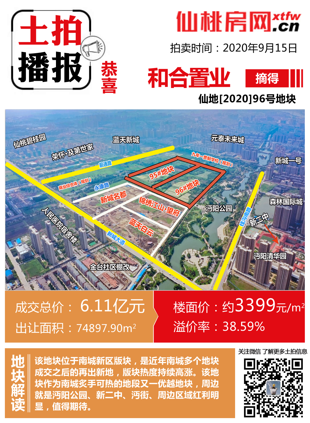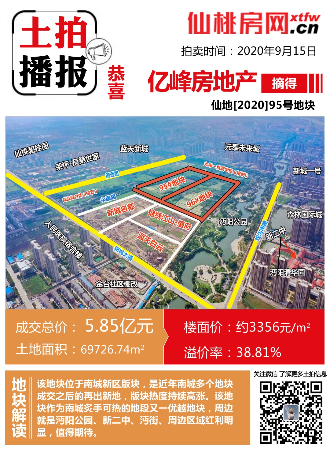 四个月前的仙地[2020]95号、96宗地块(南城新区)拍卖会上,亿峰房地产以5.85亿元的高价夺得95号宗地,以3356元/㎡的高价成为仙桃楼面破三的商品房建设用地,而96宗地块也在当天以3399元/㎡的高价成为了仙桃土拍的新“楼王”,自此仙桃正式跨入3000+元楼面价时代。