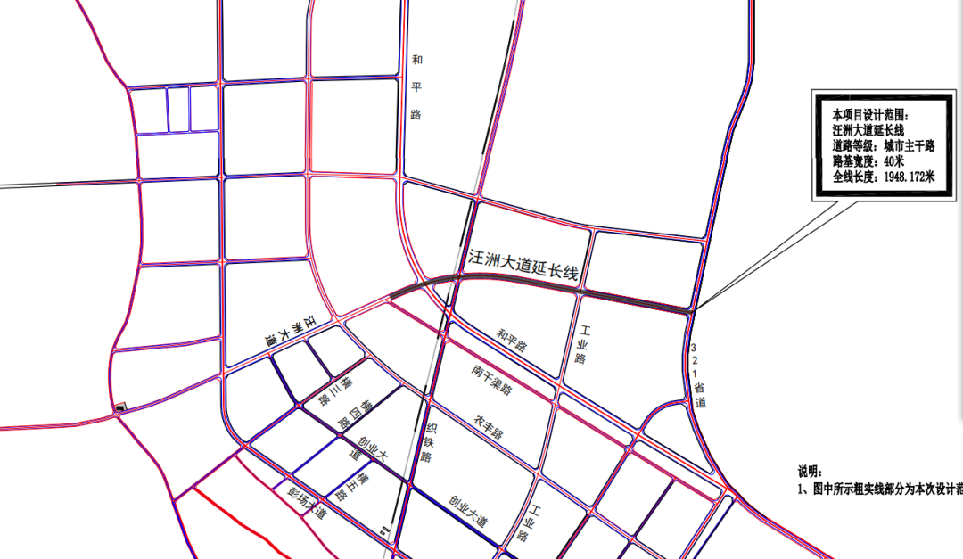 建设规模1.948km,起点与现有汪洲大道顺接,线路走向由西向东,终点与正在建设的321省道彭场至仙桃城区段改建工程相交。道路等级:城市主干路;道路规划红线宽40m;设计车速:60km/h;汽车荷载等级:城-A级;路面为沥青混凝土。