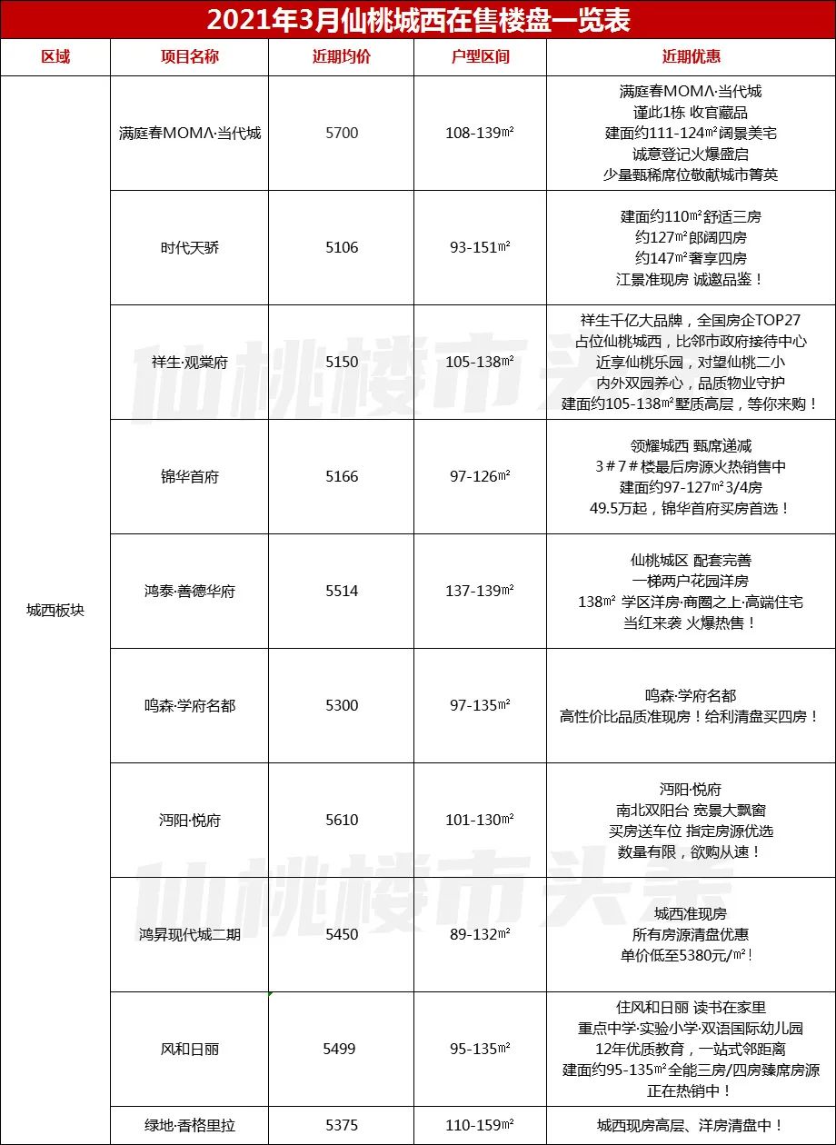 目前城西房源量比较充足的项目有实探城西板块风和日丽、时代天骄、锦华首府等,优惠力度也很大,其他项目如满庭春MOMΛ·当代城、沔阳·悦府、鸿昇现代城二期、鸣森·学府名都、鸿泰·善德华府等房源就清盘中。