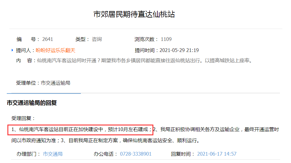中共仙桃市委办公室关于该站开通时间,给出明确答复:今年10月前后开通!
