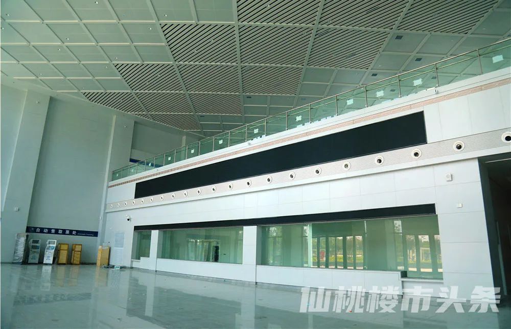 电子显示横屏、窗口服务台、窗口玻璃已早早完工;电子售票机器、车次信息显示屏均到货,放置在大厅旁侧,覆盖保护套避免损坏。