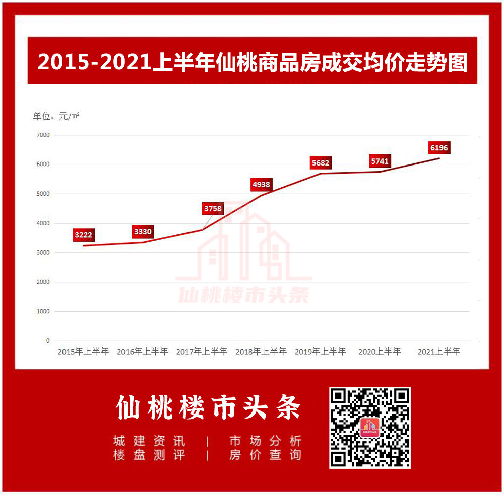 2021上半年仙桃全市商品房成交均价6196元/㎡,同比2020年(均价5742元/㎡)上浮7.9%,七年时间房价涨幅翻番,稳步上升趋势。