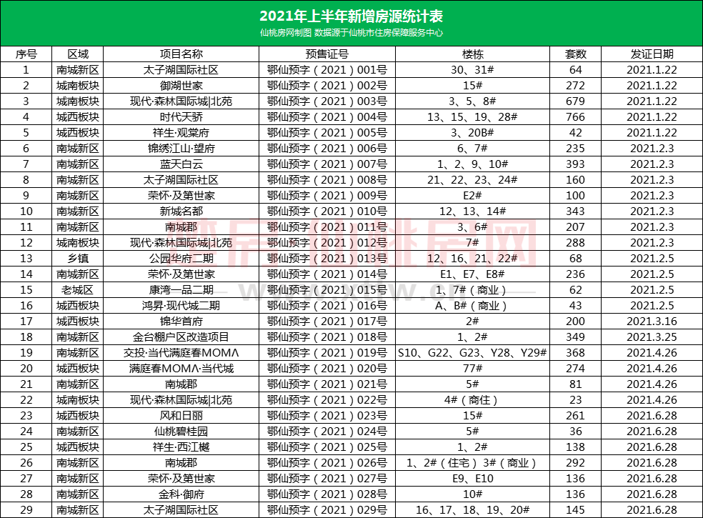 据仙桃房网统计显示,2021上半年仙桃市一共获批29张预售证,截止7月1日共有6397套房源入市,相比2020年上半年同比下降约1.95%,在这些加推的房源中,可选择的范围较广,有高层、小高层、第四代住宅、商铺等。