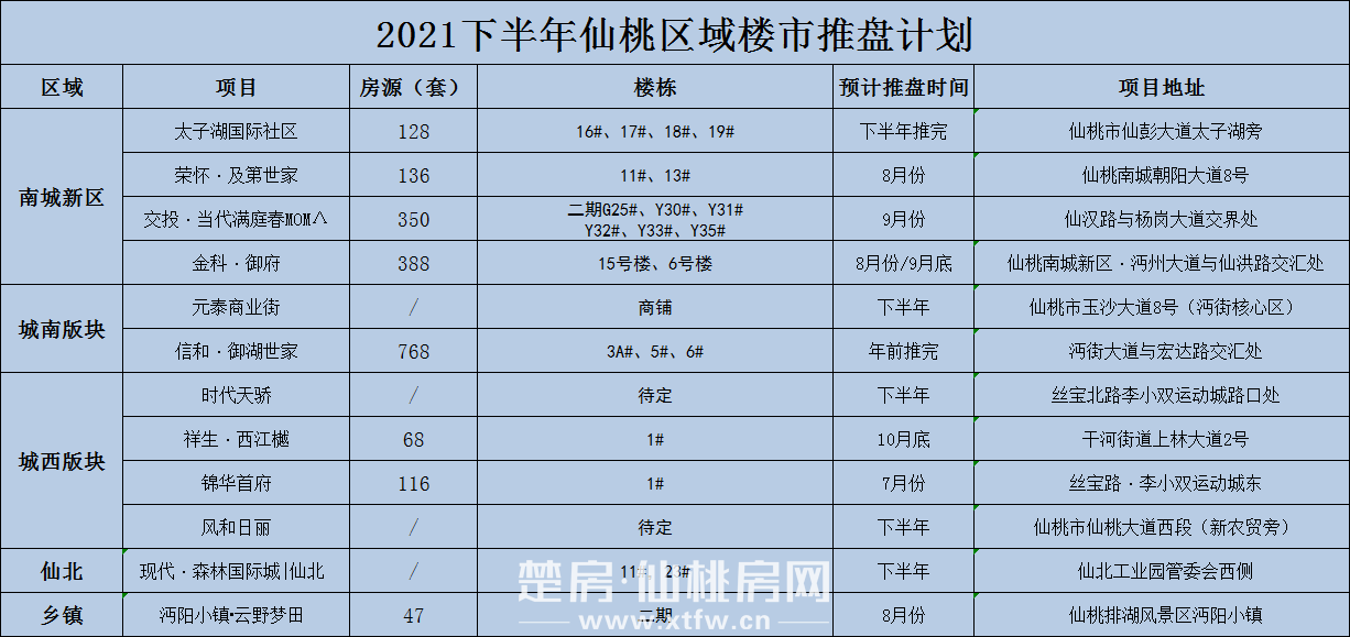 以上为仙桃网不完全统计,2021年下半年仙桃楼市住宅预计将有11个楼盘有加推的计划。