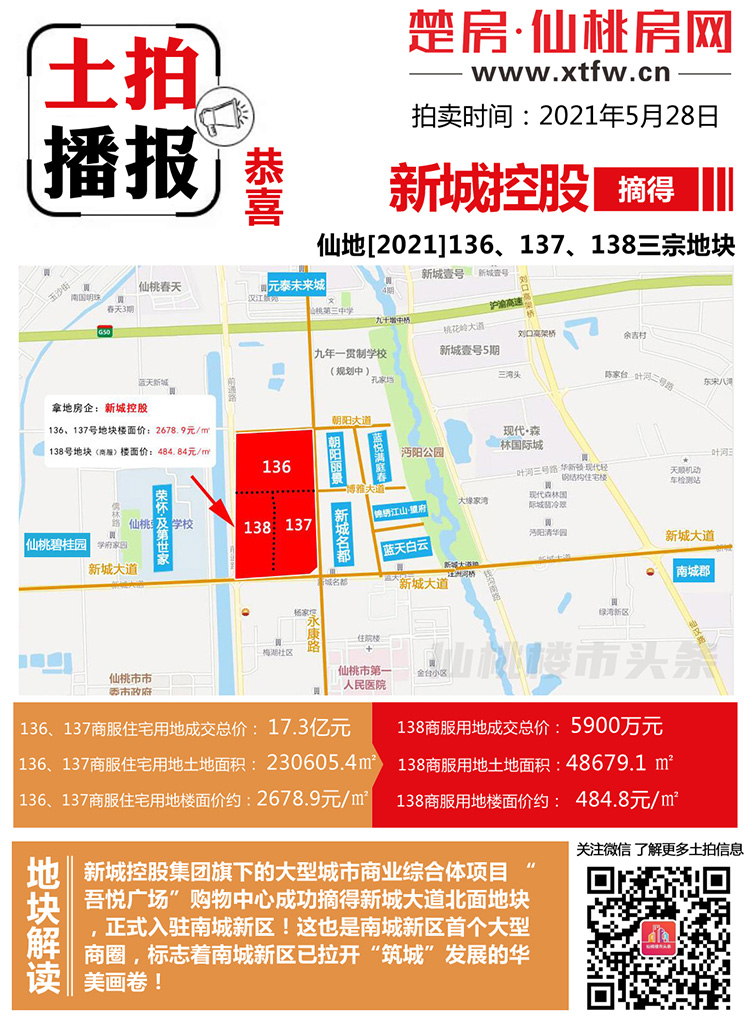 仙地【2021】136、137、138号三宗地由新城控股竞得!