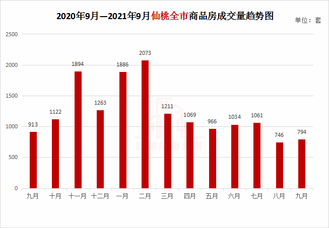 2021年9月销量公布,仙桃全市商品房成交794套,环比上涨约6.43%,同比下降约13.03%;销售总面积约72232㎡,环比下降约14.24%,同比下降约32.96%。
