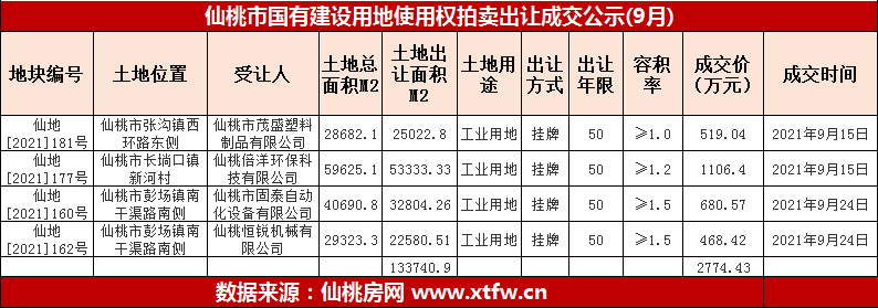 2021年9月仙桃土地出让结果公示,土地总出让面积共计133740.9㎡,共计2774.4万元。3宗都是工业用地,分别是仙地[2021]181号位于仙桃市张沟镇西环路东侧,为仙桃市茂盛塑料制品有限公司所得;仙地[2021]177号位于仙桃市长埫口镇新河村,为仙桃倍洋环保科技有限公司所得;仙地[2021]160号和仙地[2021]162号都位于仙桃市彭场镇南二渠路南侧,分别为仙桃市固泰自动化设备有限公司和仙桃恒锐机械有限公司所得。