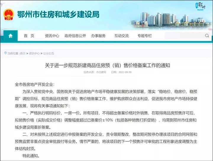 湖北省鄂州市住房和城乡建设局发布了《关于进一步规范新建商品住房预(销)售价格备案工作的通知》,文件在商品房的销售价格上规定,一方面不能超过备案价销售,另一方面,涨价或降价超过备案价10%的浮动,需要重新备案。