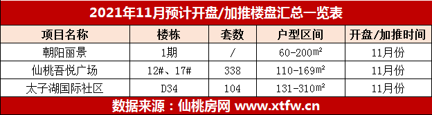 据仙桃房网统计,11月份仙桃加推的楼盘都在南城新区,其中仙桃吾悦广场和朝阳丽景均为首推,仙桃吾悦广场推出12号楼小高层和17号楼高层,共计338套,户型建面约110-169㎡;朝阳丽景推出一期项目,户型建面约130-310㎡;太子湖国际社区推出34号楼,共计104套,户型建面约143.94㎡。