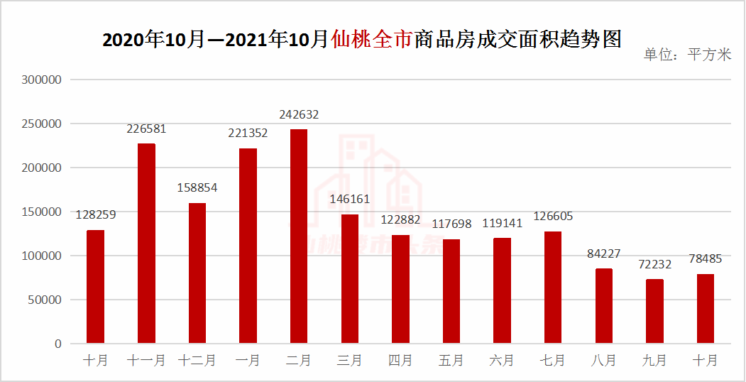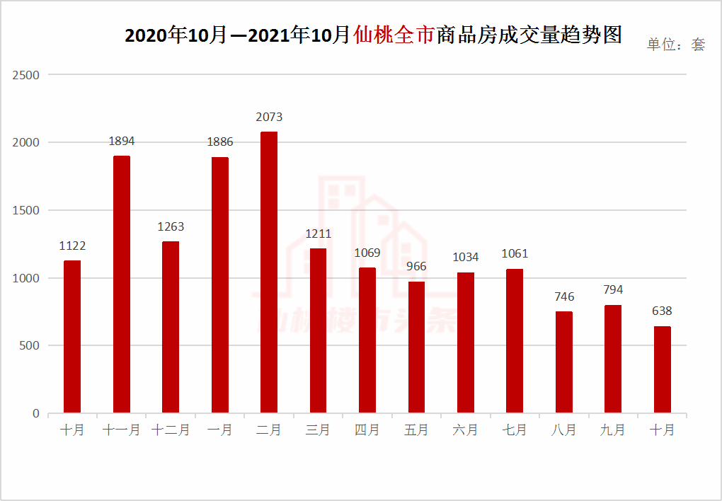 2021年10月销量公布,仙桃全市商品房成交638套,环比下降约19.65%,同比下降约43.14%;销售总面积约78485㎡,环比上涨约8.66%,同比下降约38.81%。