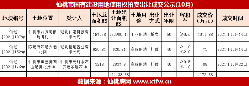 2021年10月仙桃土地出让结果公示,土地总出让面积共计194438.88㎡,共计4172.88万元。其中1宗是工业用地,地块编号为仙地[2021]197号位于仙桃市西流河镇周滩村,为湖北仙粼科技有限公司所得;其余2宗是商服用地,分别为地块编号为仙地[2021]152号位于仙桃市陈场镇陈场大道北侧,为湖北恒烜置业有限公司所得、仙地[2021]146号位于仙桃市国营排湖渔场排北分场,为仙桃市亮玲水产养殖家庭农场所得。