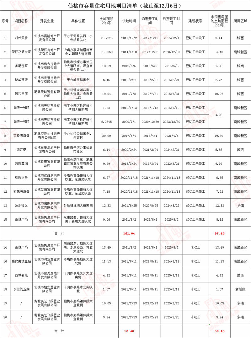 ▲仙桃市存量住宅用地信息表(截至2021年12月6日)