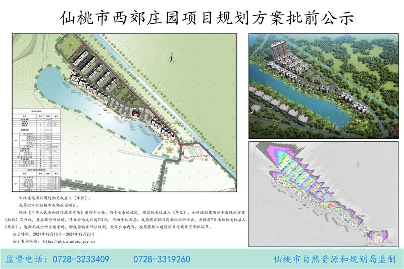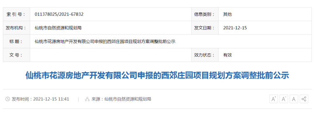 2021年12月15日,仙桃市自然资源和规划局公布了关于仙桃市花源房地产开发有限公司申报的西郊庄园项目规划方案调整批前的公示。
