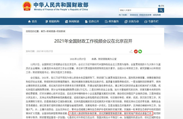 12月27日,全国财政工作会议在北京召开,会议在总结2021年财政工作时称做好房地产税试点准备工作。