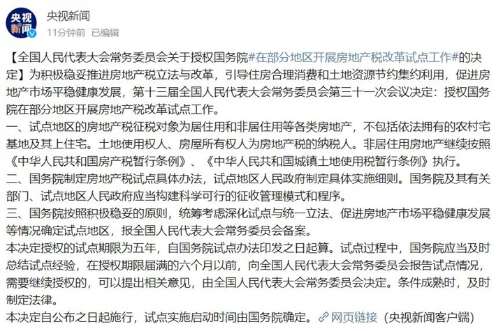 财政部和税务总局有关负责人随后公开表示,将依照全国人大常委会的授权,起草房地产税试点办法(草案),按程序做好试点各项准备工作。
