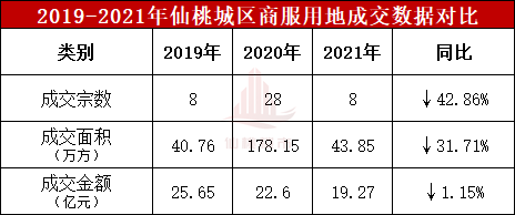 2021年仙桃城区共出让商服住宅用地8宗,较2020年相比减少20宗;出让土地总面积约43.85万方,而2020年仙桃城区商服住宅用地的成交面积是178.1万方;2021年城区商服住宅拍地合计成交金额约19.27亿元,较前一年减少约3.33亿元。