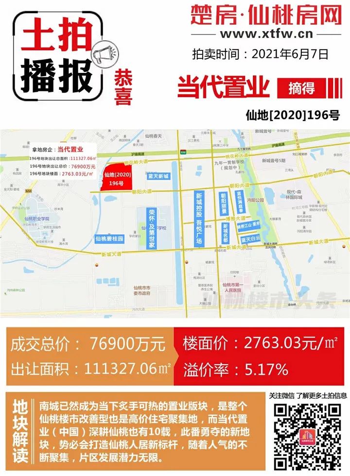 ◆当代置业仙桃再拿地,以2763的楼面价,斩获南城新区地块角逐南城!