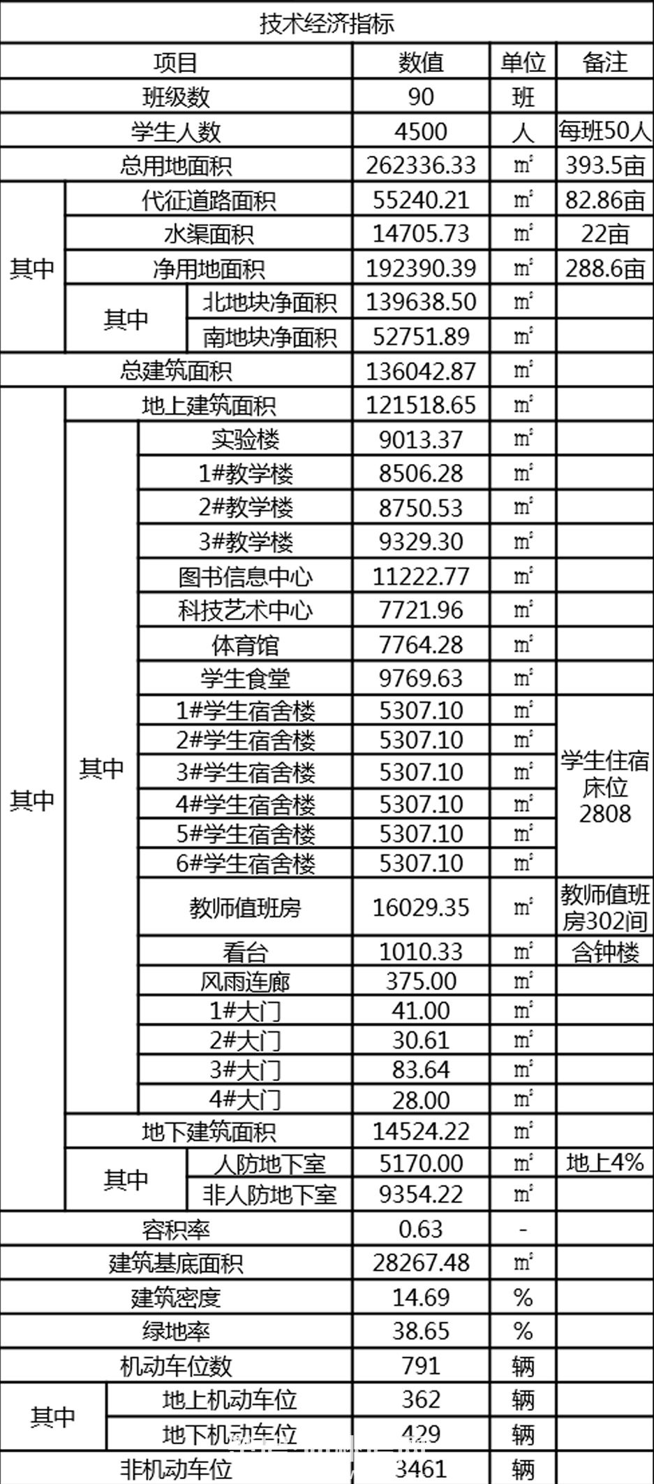 ★仙桃中学新校区技术经济指标: