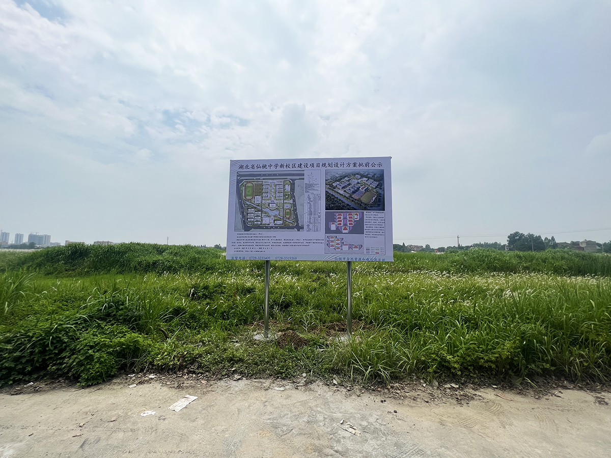 小编也在5月25日实探了仙桃中学新校区所在地,目前规划公示已经在地块上做了展示,但是暂未见动工迹象: