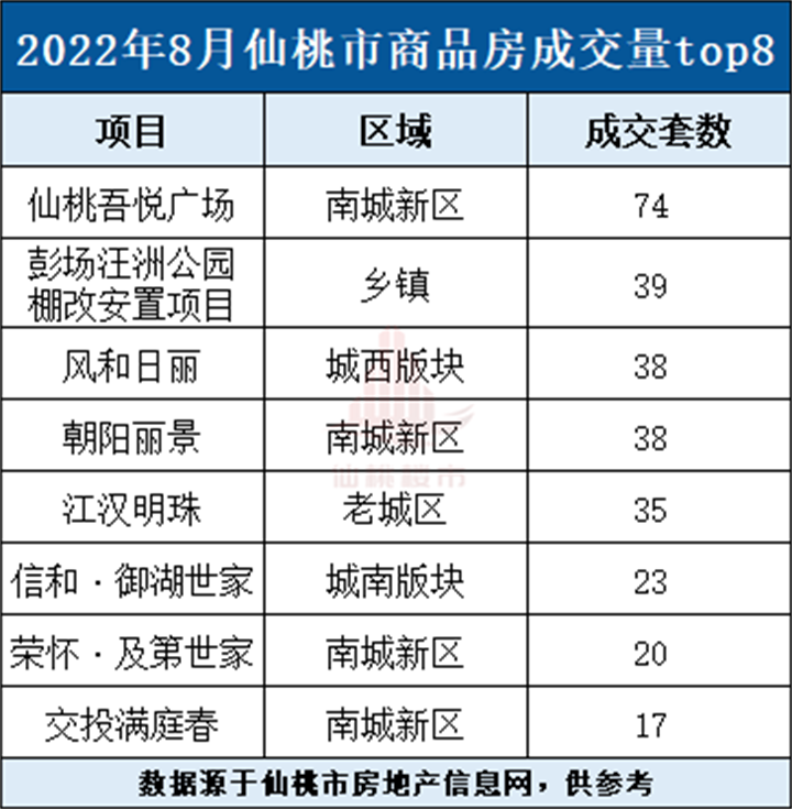 据不完全统计,本月截止本文编写之时,仙桃市新建商品住房备案成交405套,销售面积约42619.52㎡,成交量排行如下: