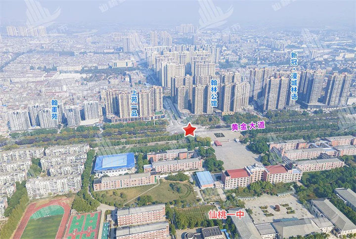 ✦仙桃一中位于黄金大道东段,学校设有初、高中两个分布, 有8000余名师生。而学校对面仅沿黄金大道就有翰墨苑、上苑一品、翰林公馆、新冠·漫城林语等四个住宅项目,再加上距离稍远一些的和合国际、福星城等,日常人流、车流量就非常大,上下学期间更是容易拥堵。