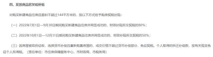 对购买新建商品住房且面积不超过144平方米的,2022年10月1日—12月31日期间购买新建商品住房并网签成功的,财政补贴所交契税的50%。