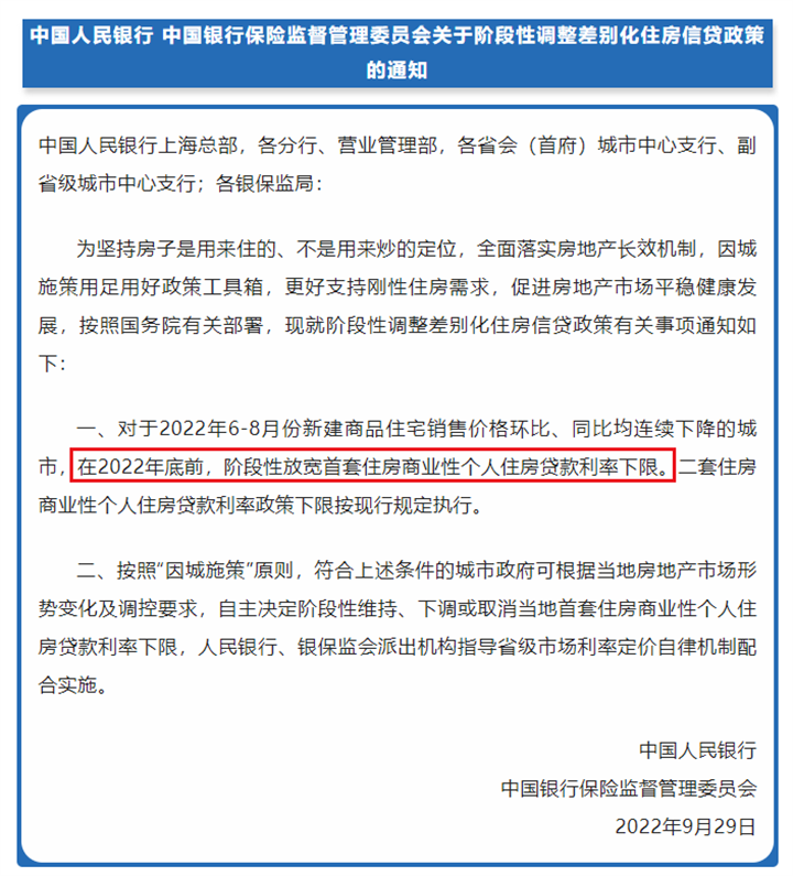 这是源于由人民银行、银保监会在9月29日发布的阶段性调整差别化住房信贷政策通知: