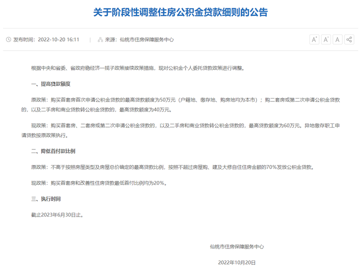 10月20日,仙桃市住房保障服务中心发布《关于阶段性调整住房公积金贷款细则的公告》,对于购买首套房、二套房或第二次申请公积金贷款的,以及二手房和商业贷款转公积金贷款的,zui高贷款额度为60万元。另外,购买首套房和改善性住房贷款zui低首付比例均调整为20%。