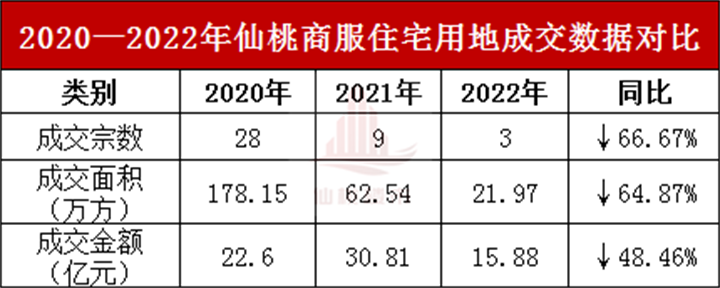 2022年仙桃城区共出让商服住宅用地3宗,较2021年同比下降66.67%;出让土地总面积约21.94万方,而2021年仙桃城区商服住宅用地的成交面积是62.54万方;2022年城区商服住宅用地合计成交金额约15.88亿元,较前一年减少约14.93亿元,同比下跌48.46%。