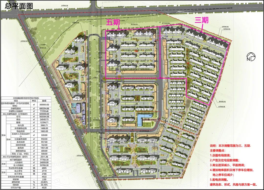 另外,从调整后的项目总平面图可以看到,交投·满庭春项目三五期原规划有楼栋共40栋,经过调整后楼栋为36栋(叠墅减少1栋,洋房减少3栋)。