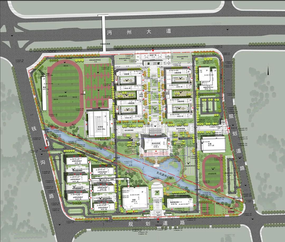 仙桃中学新校区,规划3栋教学楼,6栋学生宿舍,2个田径场,实验楼、体育馆、图书信息楼、科技艺术中心、礼堂、食堂、教师值班房等教学配套设施各1栋,4个大门。