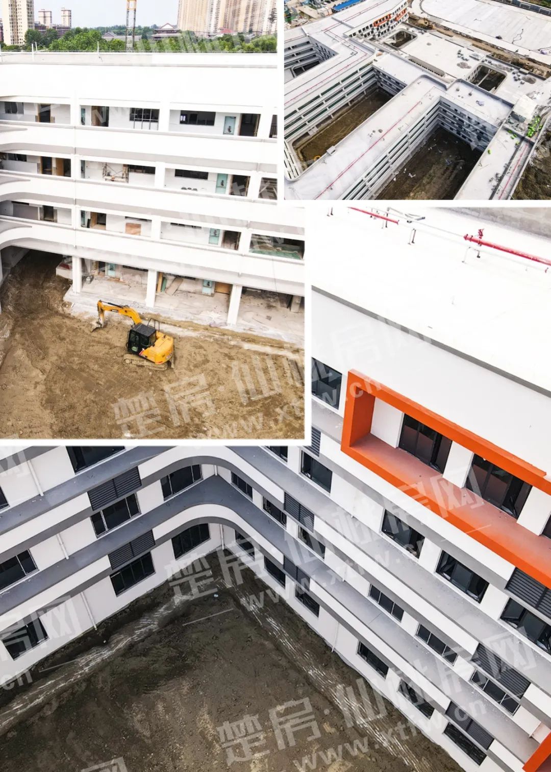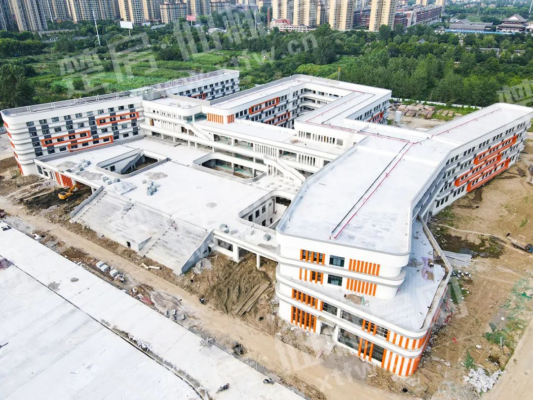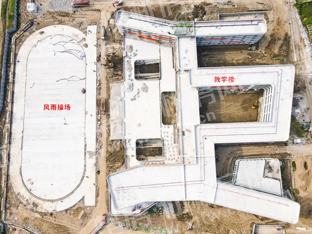 目前教学楼外立面已全面完工,内部门窗已基本安装完成,风雨操场雏形已现,正进行内部地面平整、内墙涂料施工等工程,预计将于今年9月1日建成开学。