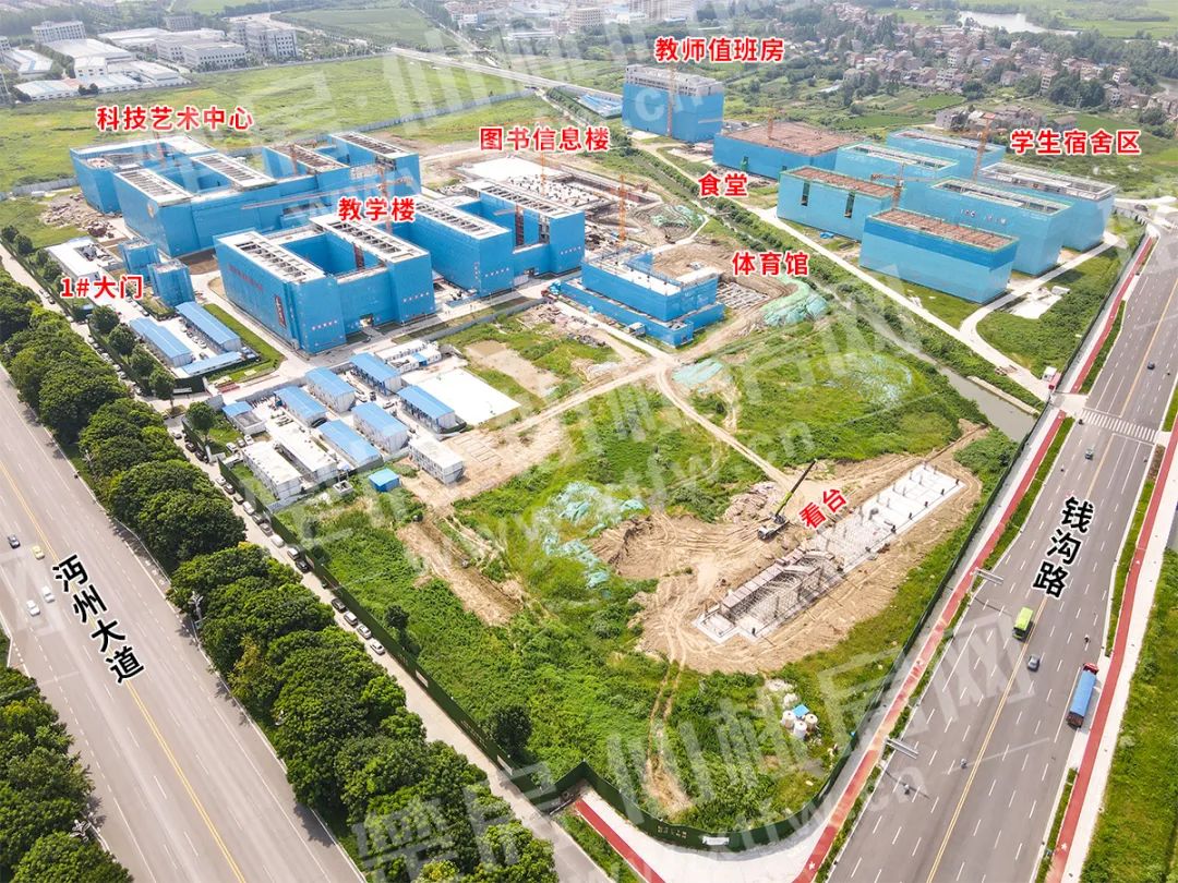 位于钱沟路东侧、沔州大道南侧。规划总用地面积262336.33㎡,总建筑面积132842.69㎡,规划3栋教学楼,6栋学生宿舍,2个田径场,实验楼、体育馆、图书信息楼、科技艺术中心、礼堂、食堂、教师值班房等教学配套设施各1栋,4个大门。