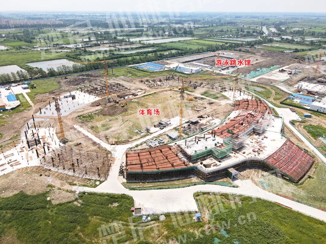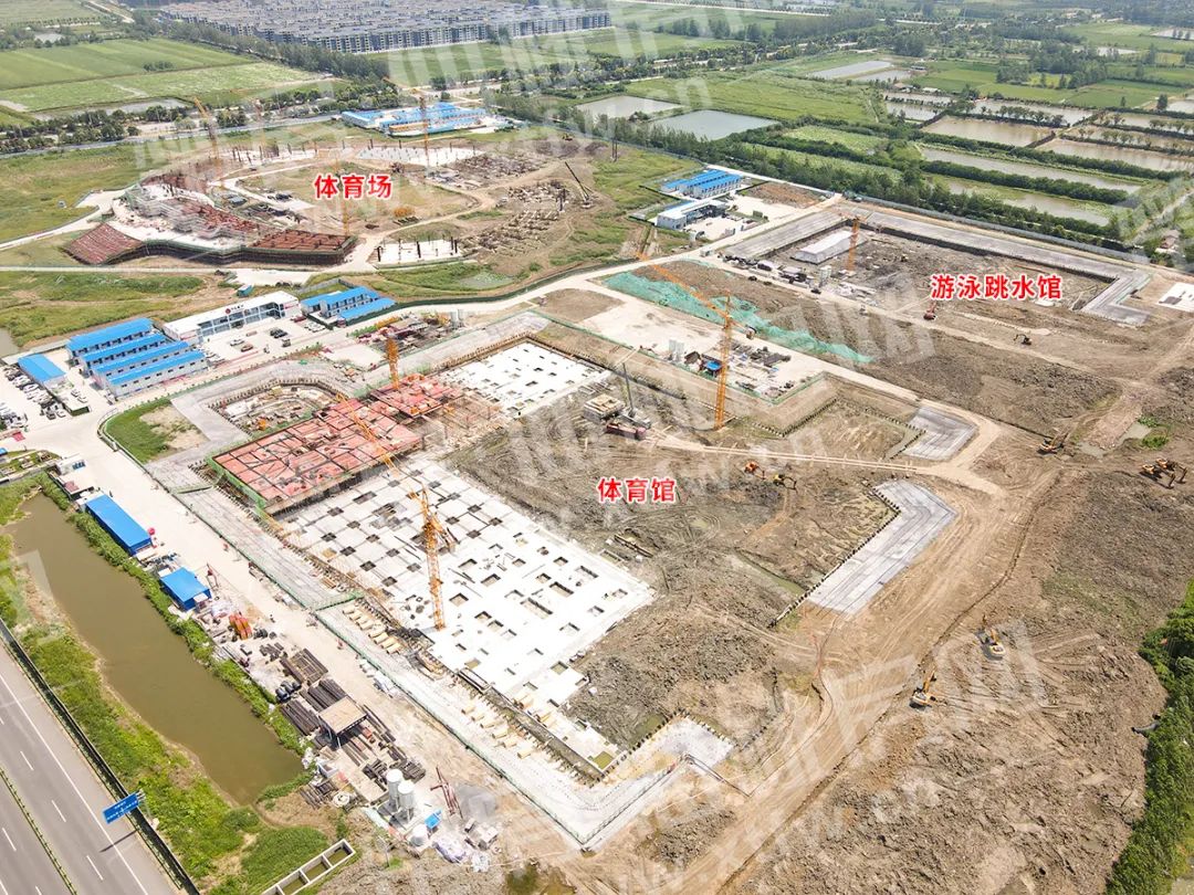 体育场正建1层;体育馆已出正负零;游泳跳水馆建设中。