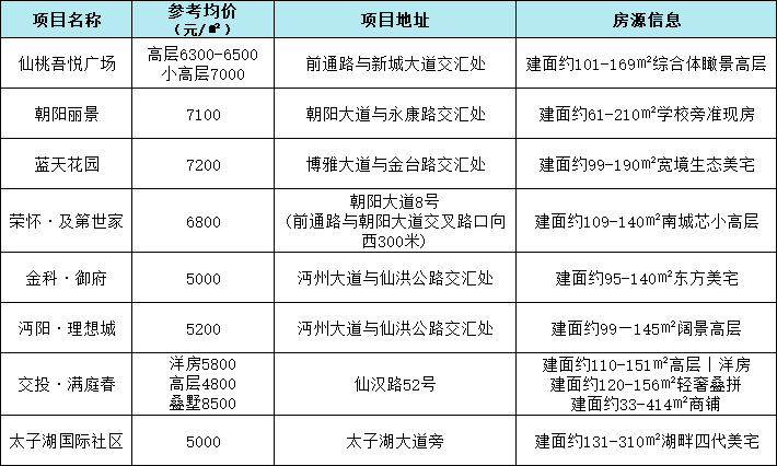 目前仙桃南城新区,在售的新房项目共计8个:仙桃吾悦广场、朝阳丽景、蓝天花园、荣怀·及第世家、金科·御府、沔阳·理想城、交投·满庭春、太子湖国际社区等。