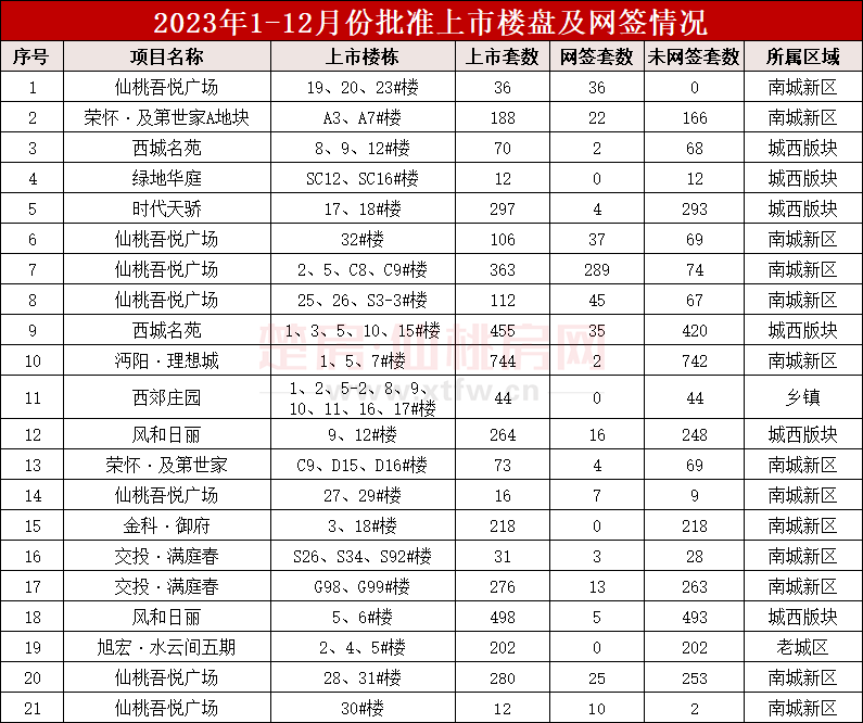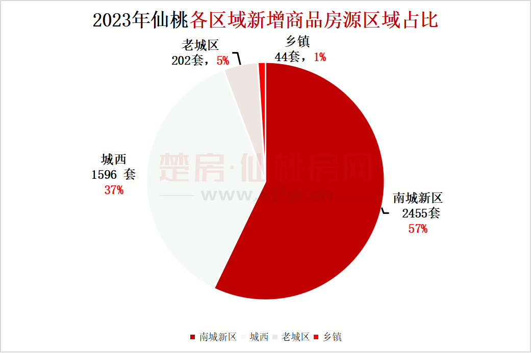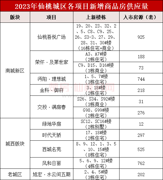 2023年,南城新区仙桃吾悦广场、荣怀·及第世家、沔阳·理想城、金科·御府、交投·满庭春等五个项目均有较大量新增商品房源入市,城区其他版块各项目新房供应量如下表。
