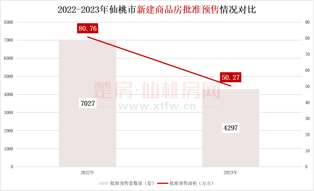 2023年全年,仙桃市新建商品住房批准预售3846套,与2022年的6251套相比,新增商品住房量减少2405套;商品住房批准预售面积47.59万方,而2022年新建商品住房批准预售面积74.46万方,同比减少36.1%。