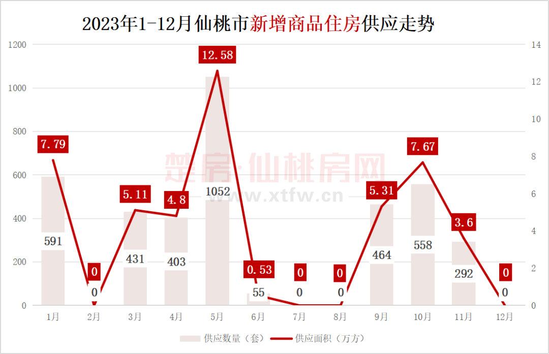 聚焦月度批准新增房源情况,全年新建商品住房供应量最多的是在5月,其中沔阳·理想城项目三栋楼取得预售许可,上市房源744套。
