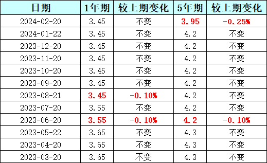 2024年2月20日,中国人民银行公布,2024年2月20日贷款市场报价利率(LPR)为:1年期LPR为3.45%,5年期以上LPR为3.95%。以上LPR在下一次发布LPR之前有效。