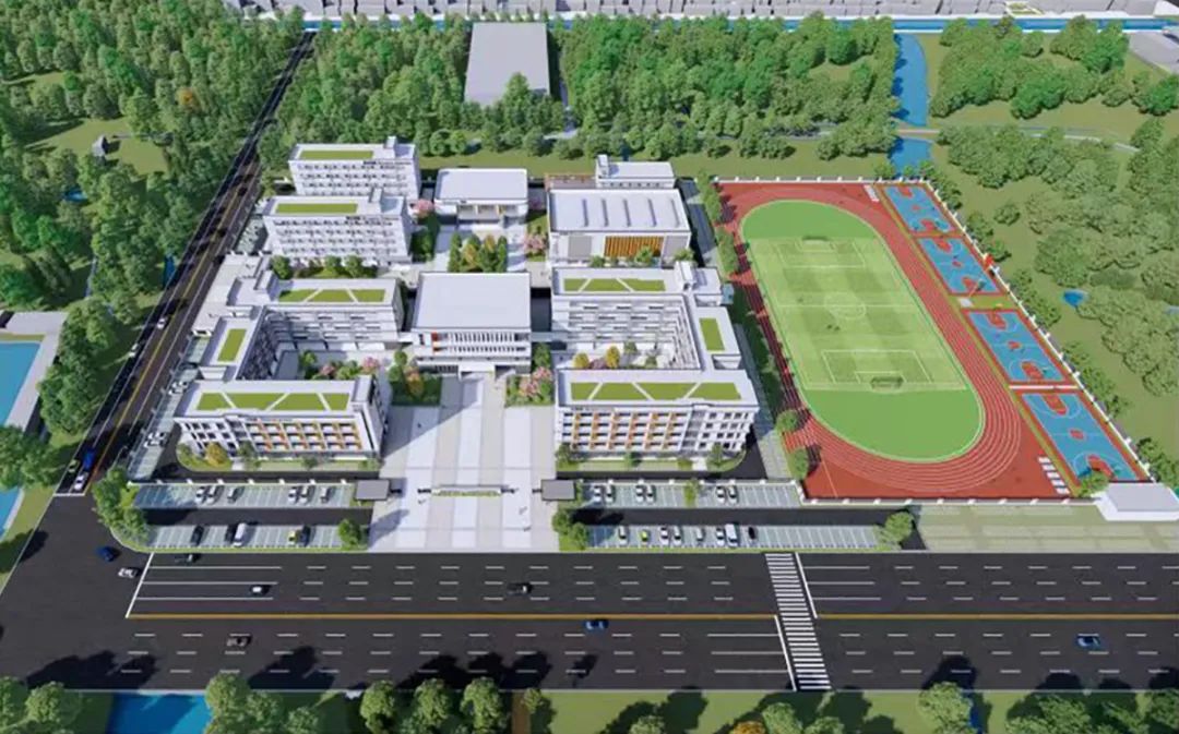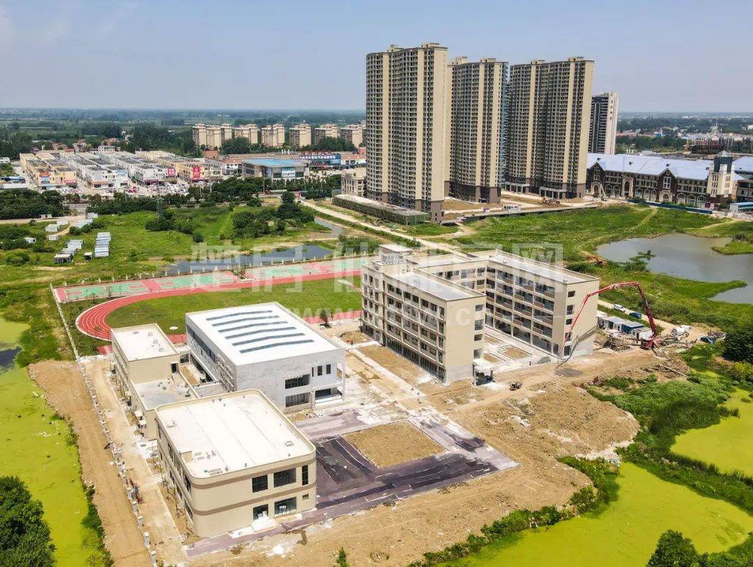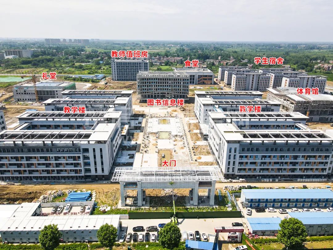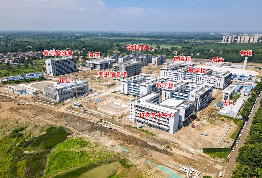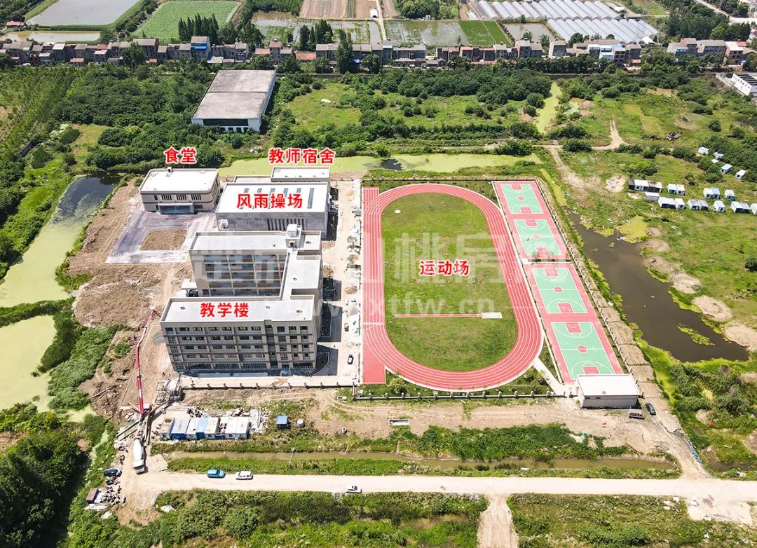 目前教学楼、风雨操场、教师宿舍、食堂等四栋楼主体结构已完工,运动场、篮球场地面已完工,整体内部、路面铺设、景观绿化等待完善,预计今年9月开学!