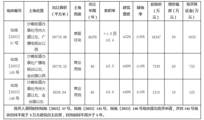 竞买人须同时对仙地[2023]57号、仙地[2023]145号、仙地[2023]146号地块提出竞买申请,并对145号地块自持不低于3万方建筑自主运营,自持时间不得少于5年。