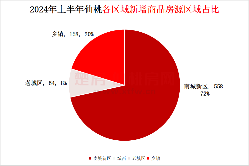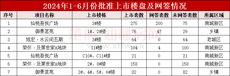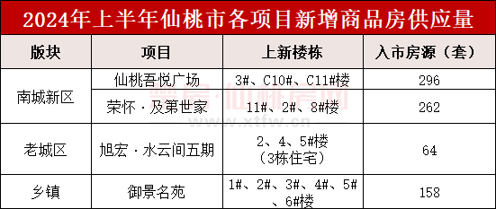 2024年1-6月,城区仅3个项目有新增商品房源入市,分别是南城新区仙桃吾悦广场296套、南城新区荣怀·及第世家262套及老城区水云间五期64套。