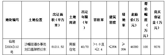 仙地2024[112]号地块规划条件中,要求建筑高度为多层、高层,其中高层不得超过18层,高度不得超过54米。停车泊位要求≥1.0车位/户,且需按总建筑面积的2‰配建物业管理用房、体育健身设施、未成年人文化活动场所、社区居家养老服务用房、社区综合服务中心等,以及规划配建幼儿园。