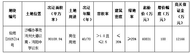 仙地2025[14]号地块规划条件中,要求建筑高度为低层、多层、高层,其中高层不得超过18层,高度不得超过54米。停车泊位要求居住≥0.8车位/户,配套商业≥1.1车位/100㎡建筑面积,且地面停车位数量不得超过住宅总套数的15%。