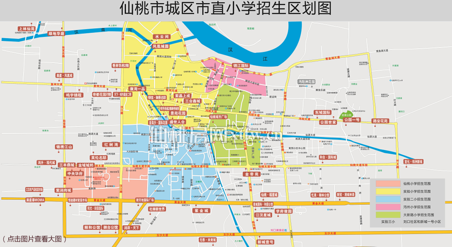 | 仙桃小学 | 丝宝路口三丰鼎城向东,经仙桃大道中段至大洪路,向南到黄金大道,向西至丝宝路向北到三丰鼎城止,另含干河办事处肖台村所辖区域、轻纺路以西的大洪村所辖区域。 |