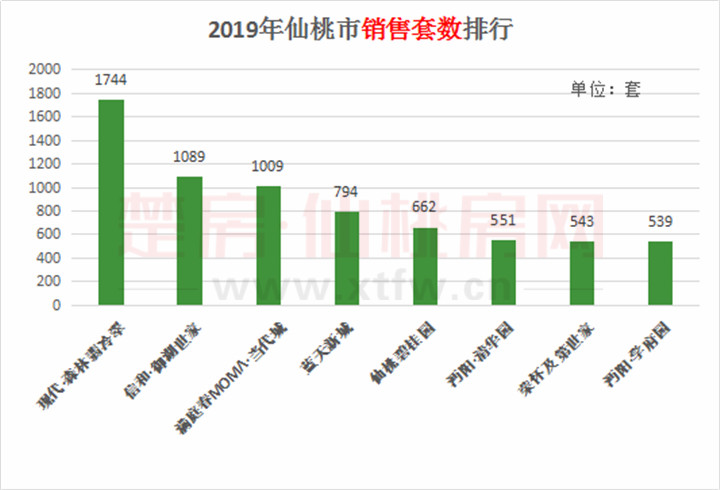 根据仙桃市房地产信息平台网数据显示,2019年仙桃商品房楼盘成交前两名均来自南城片区,第一名为现代·森林翡冷翠,全年销售1744套,成交量第二名为信和·御湖世家,全年销售1089套。第三名是来自满庭春MOMΛ·当代城,全年销量1009套。