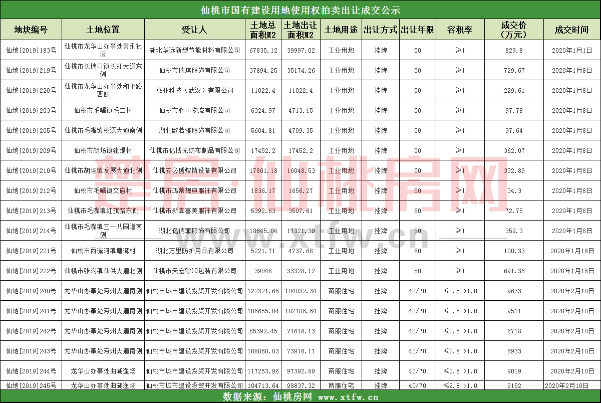 2020年1-4月仙桃土地出让结果公示,土地总出让面积共计738169.47㎡,共计54903.5万元。